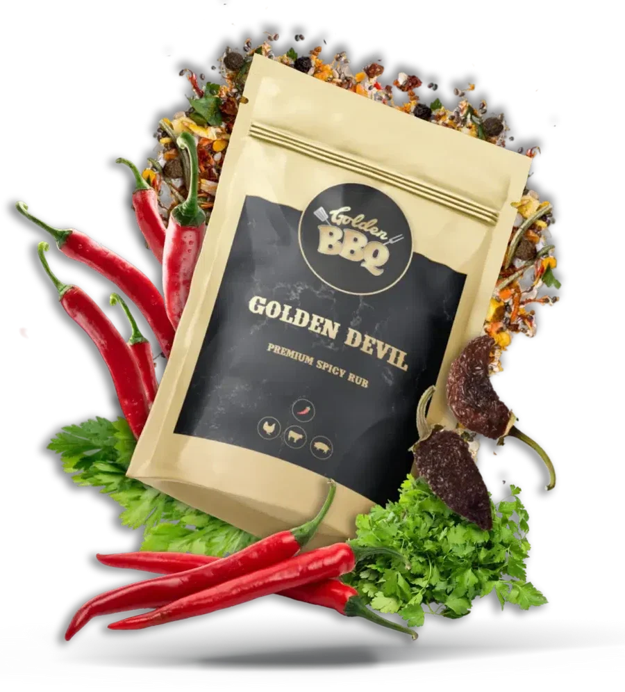 Kies je favoriete vlees (bijvoorbeeld een ribeye steak, spareribs of kippenvleugels) en kruid deze met de Golden Devil kruidenmix. Gebruik 35 gram kruiden per kilogram vlees. Breng een gelijke laag van de rub aan op alle kanten van het vlees. Laat het even intrekken voor het beste resultaat.