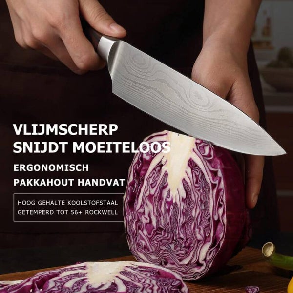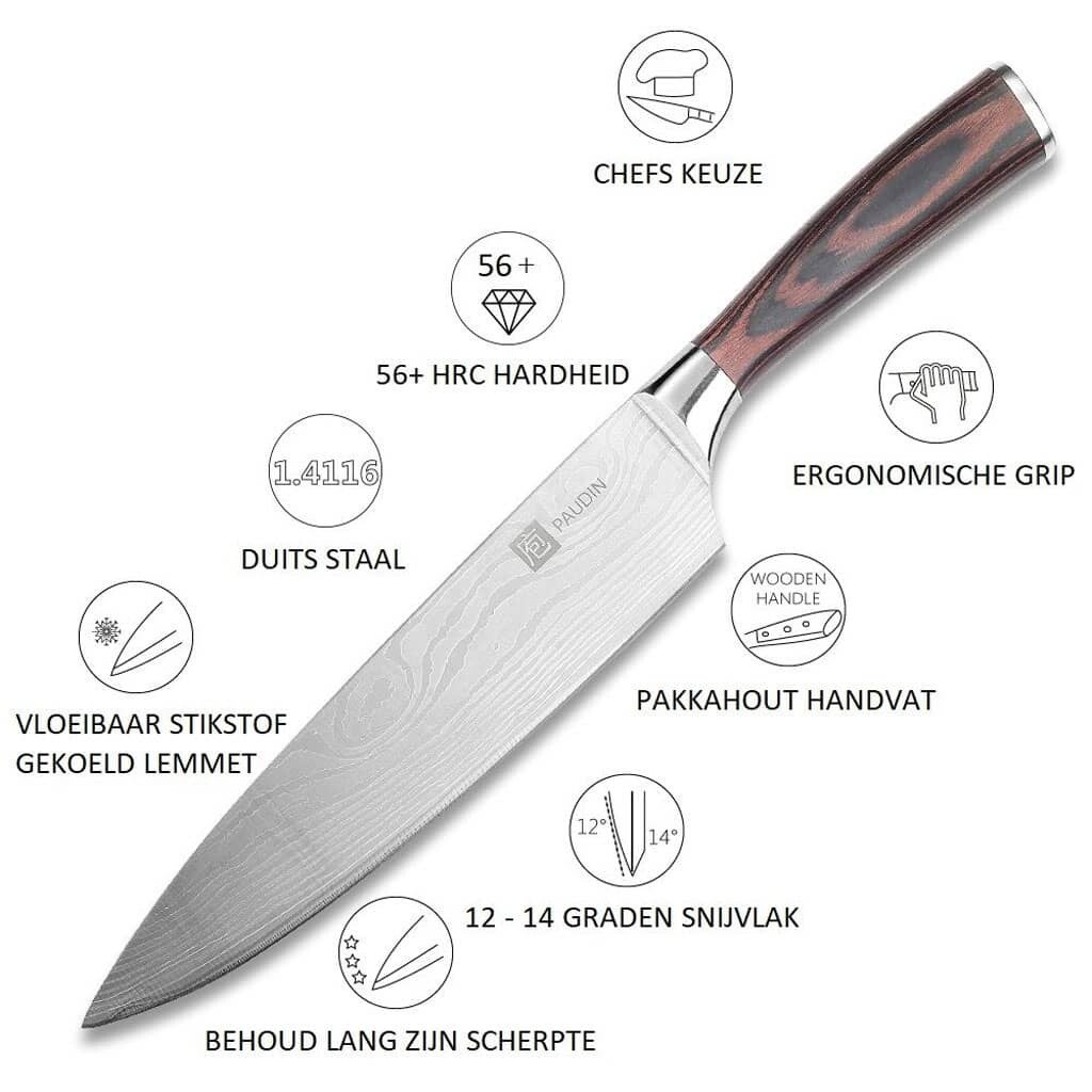 Ervaar de topprestaties van het Paudin Universal N1 Koksmes! Dit keukenmes met zijn 20 cm lange lemmet en zijn prachtig ingelaserd damascus patroon is ongeëvenaard in kwaliteit en design. Jouw essentiële keukenpartner, geschikt voor alles van barbecueën tot fijne gastronomie.