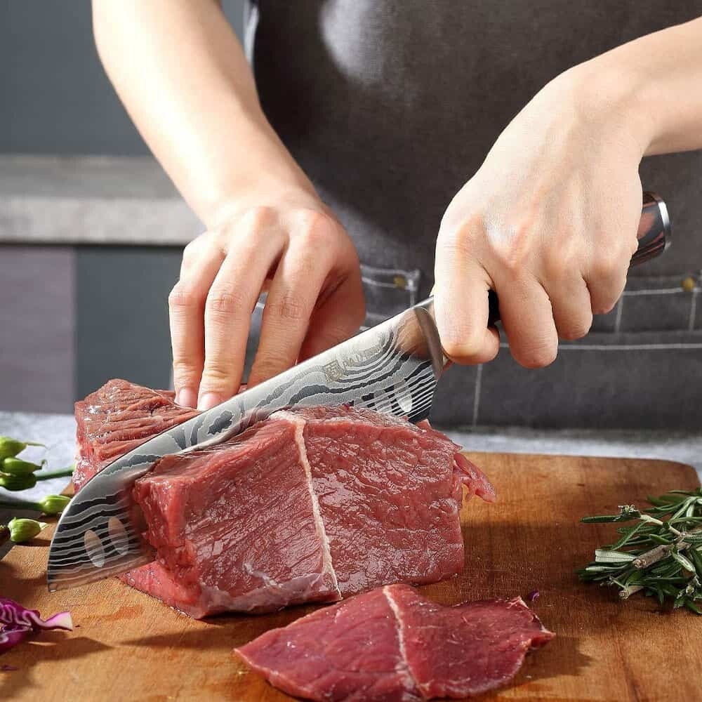 Damascus patroon: Het prachtige ingelaserde Damascus patroon maakt dit mes tot een blikvanger in je keuken. Het patroon draagt bij aan de stijlvolle uitstraling van het mes en maakt het een waardevolle toevoeging aan je keukengereedschap.
