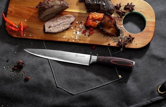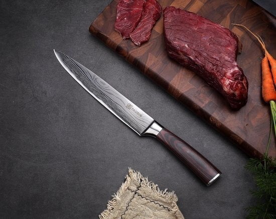 Het unieke gelaserde damascus patroon geeft dit vleesmes een stijlvolle uitstraling. Bovendien is het TUV gecertificeerd, wat betekent dat het veilig is voor voedselbereiding. Het N9 Premium Japans Vleesmes biedt alles wat je nodig hebt voor perfecte sneden in de keuken.