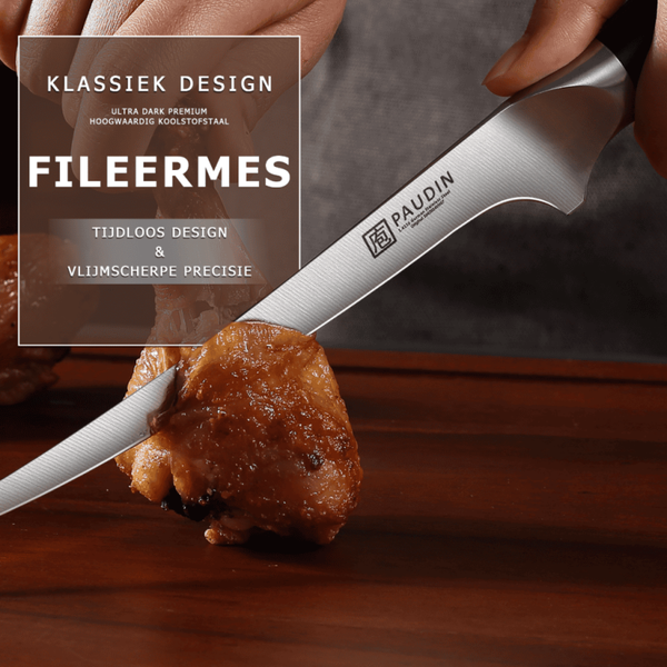 Het Ultra Dark D10 Fileermes van Paudin onderscheidt zich door zijn slanke, flexibele lemmet waarmee je met chirurgische precisie vis of vlees kunt fileren. Het uitgebalanceerde ontwerp zorgt voor perfecte wendbaarheid, zodat je eenvoudig de huid van een zalm losmaakt of spareribs schoon fileert.